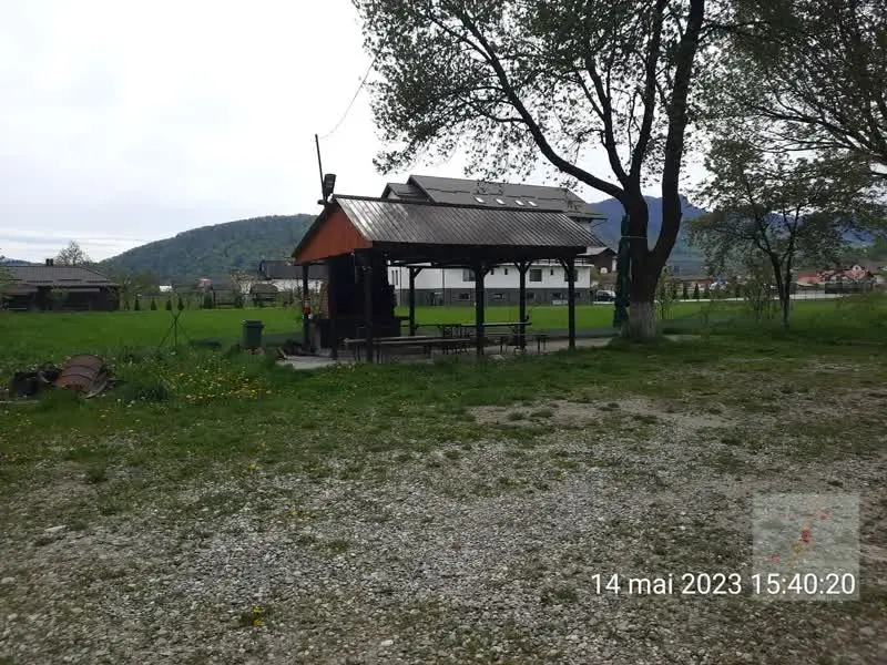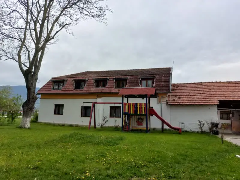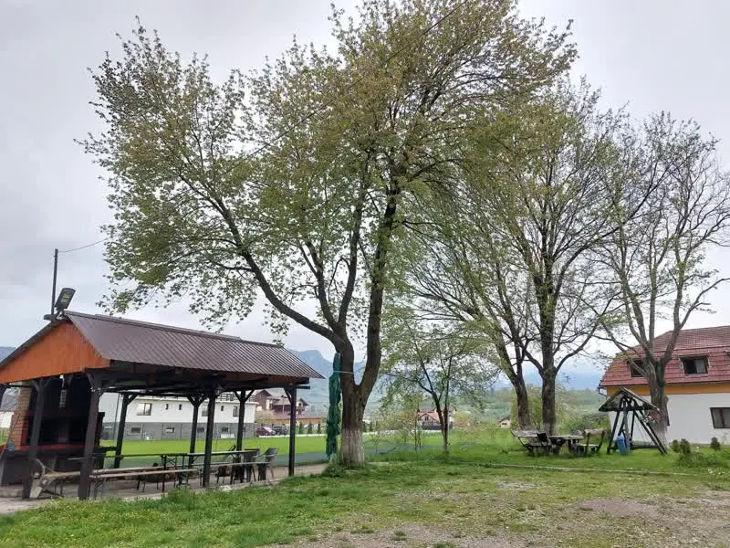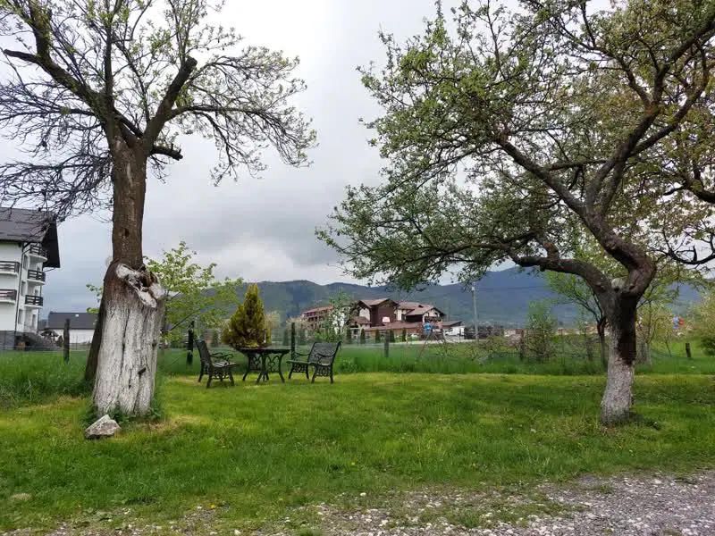 în interior față de DN 73A la intrarea în pitorescul Bran, în Tohanul Nou (dinspre Zărnești). Suntem în mijlocul naturii, aparați de zgomotul străzii de o superbă livadă de pomi,